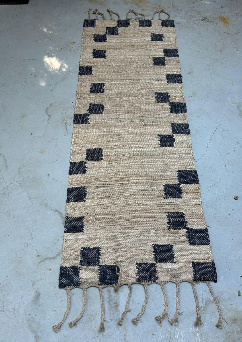 שטיח חבל למסדרון בצבע טבעי משולב דוגמת ריבועים שחורה. גודל: 200×70 ס”מ.
